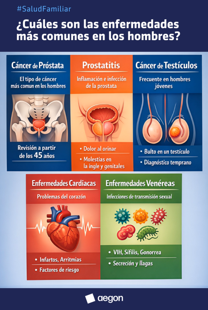 Las enfermedades más comunes en hombres incluyen cáncer de próstata, cáncer de testículos, prostatitis, enfermedades cardíacas y enfermedades venéreas. Muchas de ellas pueden prevenirse o detectarse precozmente mediante revisiones médicas periódicas, hábitos de vida saludables y la utilización de un seguro de salud que facilite el acceso a diagnósticos tempranos y atención especializada. La vigilancia de síntomas como dolor al orinar, secreciones, dolores pélvicos o masas palpables es clave para actuar a tiempo.